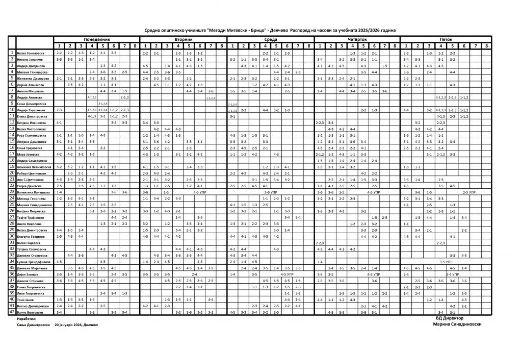 РАСПОРЕД НА ЧАСОВИ ЗА УЧЕБНАТА 2025/2026 ГОД